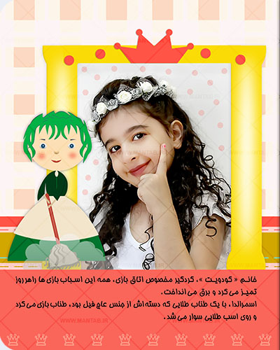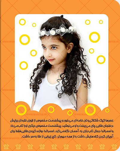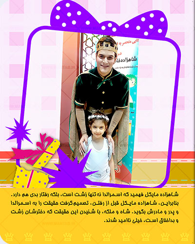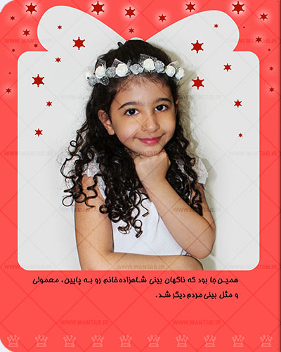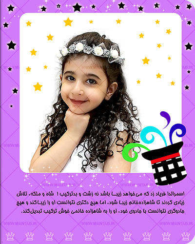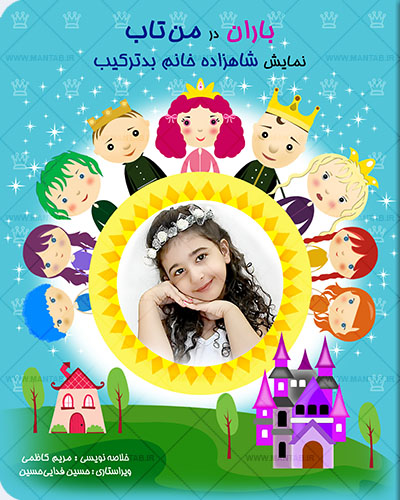 شما می توانید با توجه به حالات مورد نیاز برای این داستان ، از فرزندتان عکس گرفته و برای ما ارسال کنید، تا داستان این من تاب ، با نام و عکس های ارسالی ، بصورت کاملا اختصاصی برای فرزند دلبند شما چاپ و ارسال گردد.